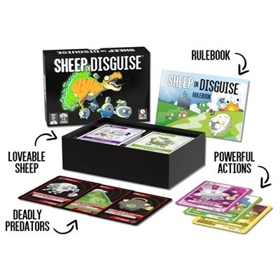 DESCRIPTION Sheep in Disguise is a vibrant and strategic card game about protecting adorably helpless sheep from being devoured by the many outrageous and dangerous predators of the world. Collect flocks of sheep, keep them safe from attacks, and use action cards to destroy anyone that gets in your way!